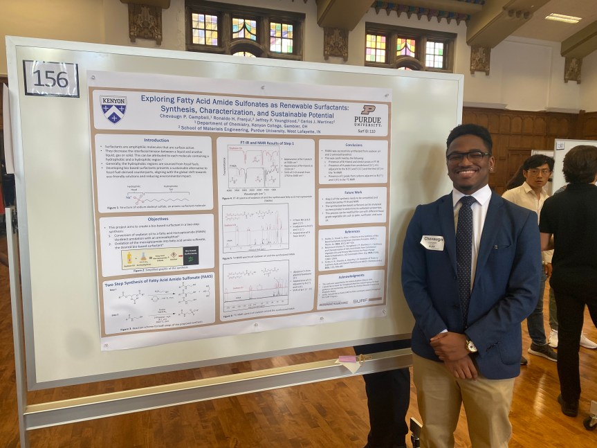 We want to extend our congratulations to Chevaugn for his excellent presentation on the synthesis of biobased surfactants during the Purdue SURF poster session. Chevaugn built upon the work of Dr. Yue Zheng, who has since moved on to Applied Materials. Professor Jeffrey Youngblood provided co-advisement to Chevaugn throughout the entire process of synthesizing the surfactant. We wish him every success in his senior year at Kenyon College and look forward to seeing him again at Purdue in the future!