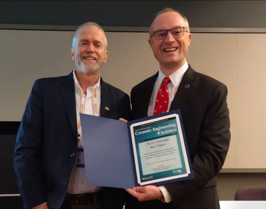 Our article titled “Radiation Heat Transfer During Hypersonic Flight: A Review of Emissivity Measurement and Enhancement Approaches of Ultra-High Temperature Ceramics,” co-authored by Dr. Abdullah Al Saad and Prof. Trice, was recently awarded an American Ceramic Society Best Paper Award. All the praise goes to Dr. Al Saad and Prof. Trice for their hard work and expertise. The paper was published in the International Journal of Ceramic Engineering & Science (IJACT). The photo shows Prof. Trice receiving the award at the MS&T Meeting in Pittsburgh by Prof. John Mauro of Penn State. The image is from the LinkedIn post by the Purdue School of Materials Engineering found here: https://www.linkedin.com/posts/purdue-university-school-of-materials-engineering_freepaperfriday-activity-7263266321096744961-KJAa?utm_source=share&utm_medium=member_desktop